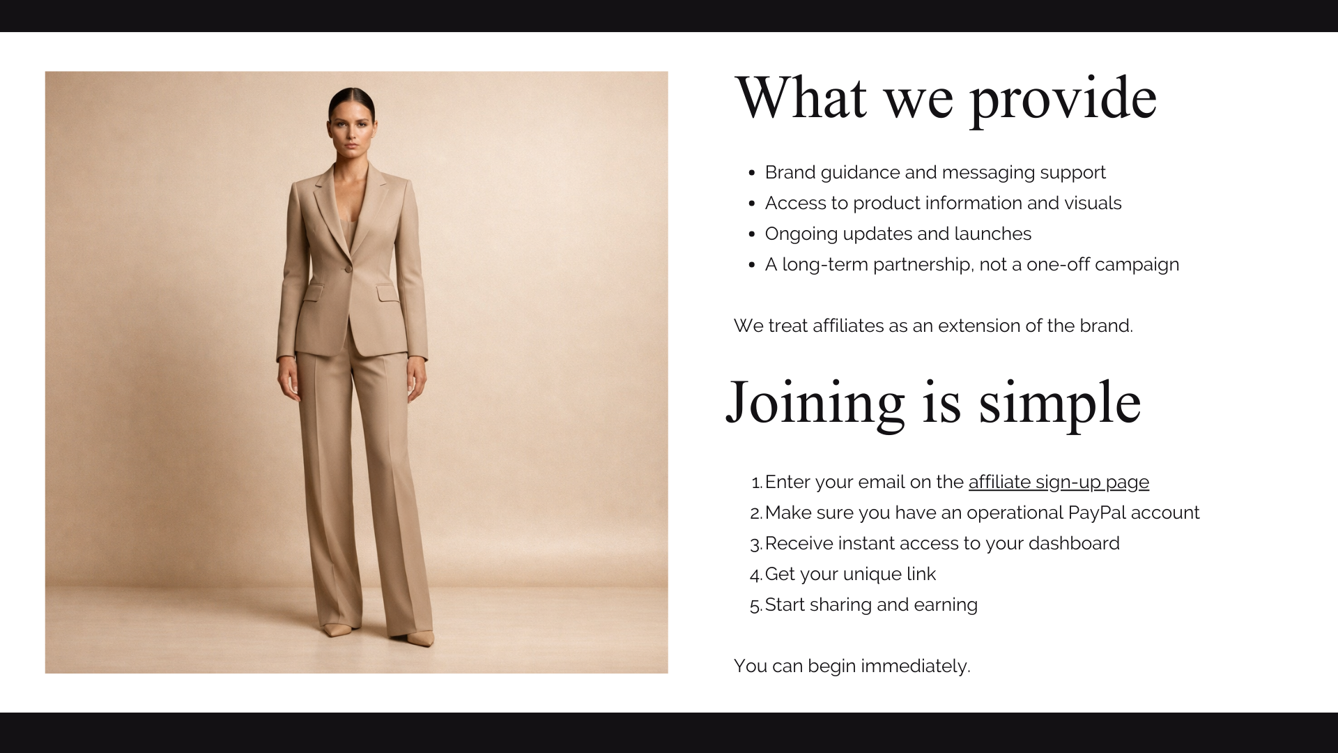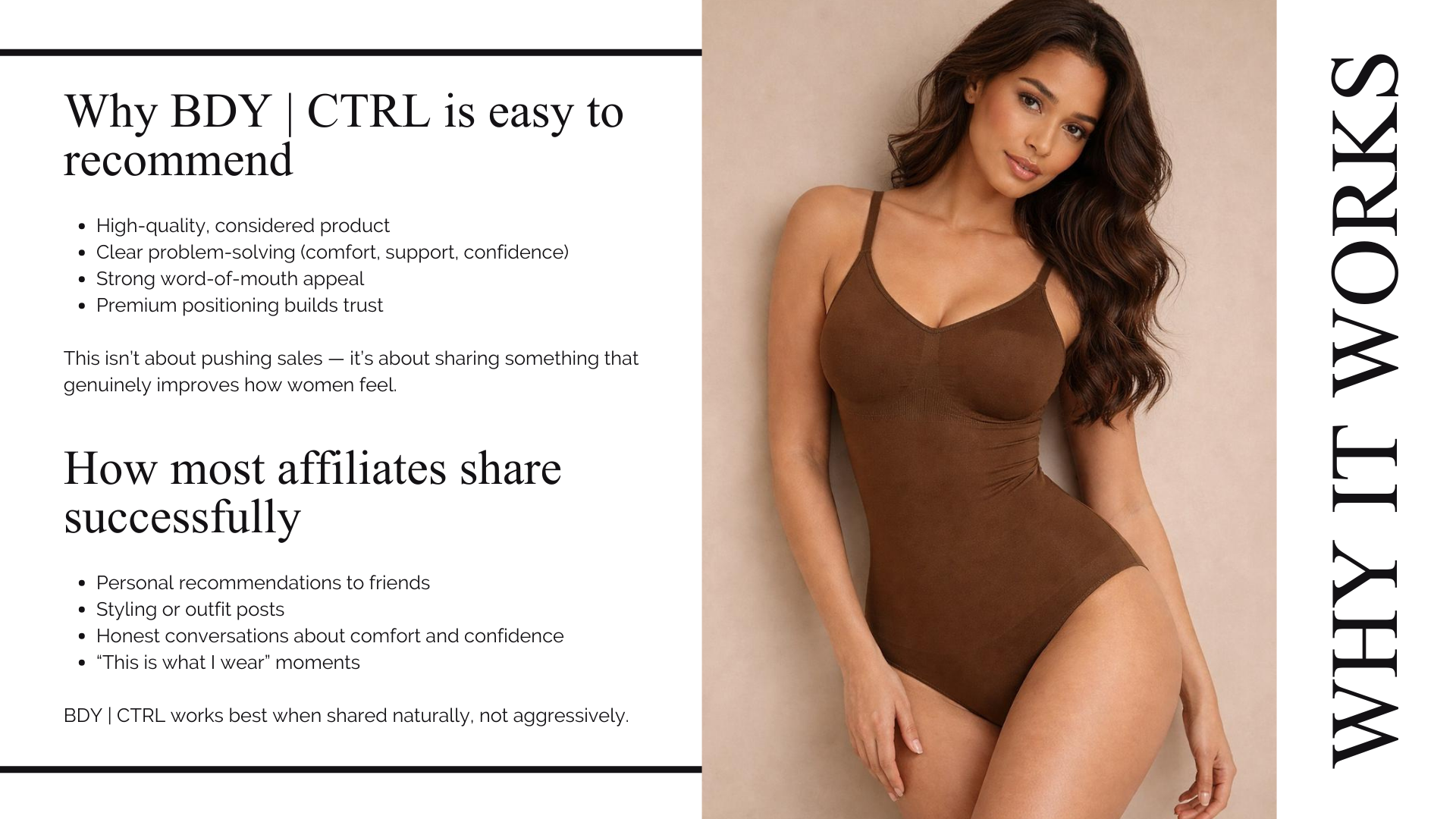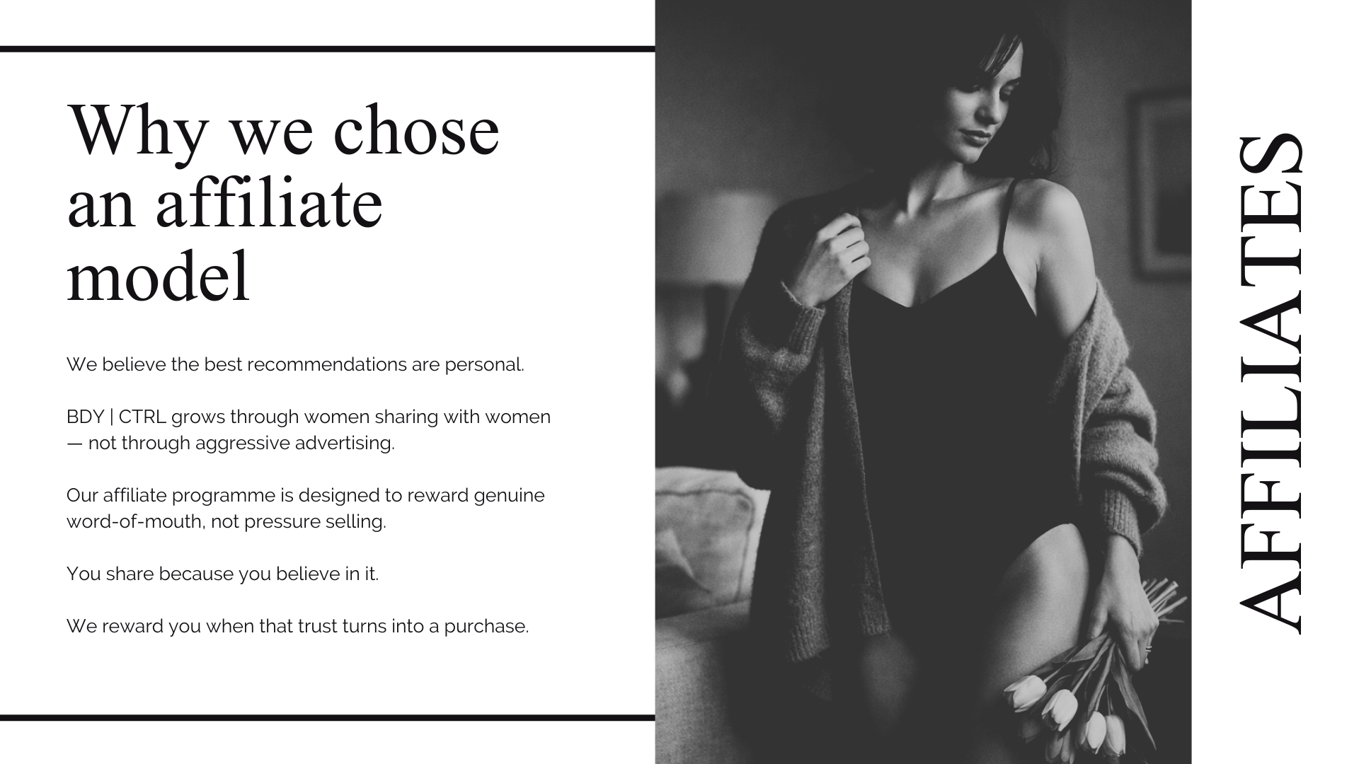 This information pack has been created to give you a clear understanding of the BDY | CTRL Affiliate Programme, how it works, and what you can expect as part of our community. Inside, you’ll discover our brand philosophy, commission structure, and the support we provide to ensure your experience is seamless, rewarding, and aligned with the quiet confidence that defines BDY | CTRL.