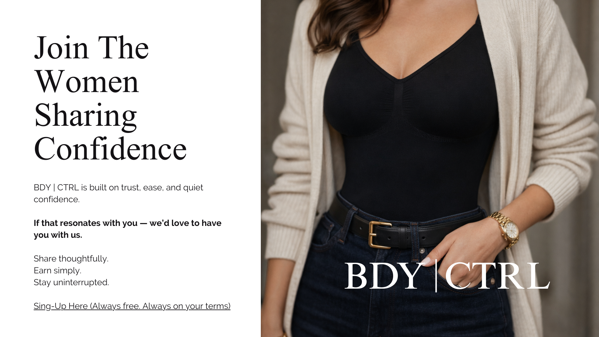 If our approach resonates with you, we invite you to join us. Becoming an affiliate is simple, always free, and designed to fit naturally into the way you already share products you believe in. Just click the 'Join Today' button below, or email us at affiliate@bdy-ctrl.com if you have more questions.